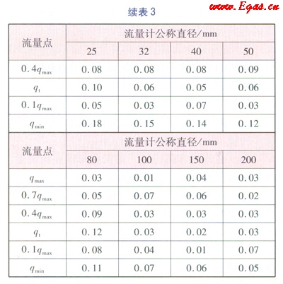 試驗的方法為:在標準表校驗裝置上被檢表的位置安裝好待測的儀器后,按照校驗流量計的方法分別對qmin、0.1qmax、qt、0.4qmax、0.7qmax和qmax的流量點進行校驗。qmin為流量計的標稱最小流量;qmax為流量計的標稱最大流量;qt為分界流量,即流量范圍被分割成“高區(qū)”和“低區(qū)”的分界點的流量,“高區(qū)”的準確度等級為流量計的標稱準確度等級,“低區(qū)”的準確度等級為流量計的標稱準確度等級的2倍。