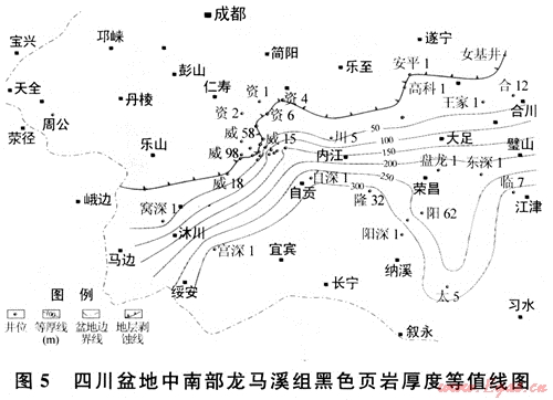 根據(jù)現(xiàn)有鉆井資料,筆者繪制了筇竹寺組和龍馬溪組黑色頁巖在四川盆地中南部的厚度分布圖。從圖4、5可以看出,除龍馬溪組黑色頁巖在古隆起頂部被剝蝕殆盡外,這兩套黑色頁巖在大部分區(qū)域內(nèi)均穩(wěn)定分布,厚度一般都在200m以上,而且均有向南或東南方向逐漸增厚的趨勢。
