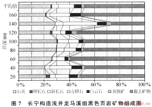 實(shí)際上,廣義的頁巖氣還應(yīng)該包括儲存在黑色頁巖所夾的薄層泥質(zhì)粉砂巖和各種砂巖中的天然氣。這些泥質(zhì)粉砂巖和砂巖相對純頁巖而言有較多的孔隙,因此儲存于其中的天然氣多為游離氣,可隨頁巖中的吸附氣一并采出。四川盆地這兩套黑色頁巖普遍含砂質(zhì),淺色石英粉砂微細(xì)紋層與暗色泥質(zhì)層交互沉積而顯水平紋理,石英分布不均,局部富集而成泥質(zhì)粉砂巖。此外,頁巖中還微含鈣質(zhì),底部多含硅質(zhì),黃鐵礦也較豐富,多呈星散狀分布。對長寧構(gòu)造龍馬溪組黑色頁巖巖心樣品的礦物成分分析結(jié)果也表明,石英含量在20%~30%之間,方解石和白云石含量多在10%~25%,高者可達(dá)35%,黃鐵礦含量在1%~4%之間(圖7)。由于黑色頁巖砂質(zhì)和鈣質(zhì)較重,因此其性較脆、硬,在加砂壓裂中容易產(chǎn)生裂縫,這對于頁巖氣的開采極為有利。