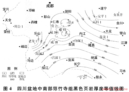 下古生界黑色頁巖集中分布在下寒武統(tǒng)筇竹寺組、下奧陶統(tǒng)大灣組和五峰組及下志留統(tǒng)龍馬溪組等4個層段中。大灣組(或大乘寺組)黑色頁巖在盆地西南部較發(fā)育,其厚度一般在45~140m,特別是在威遠(yuǎn)地區(qū)分布穩(wěn)定,也是未來下古生界頁巖氣勘探值得重視的一套目的層。五峰組黑色頁巖雖分布穩(wěn)定,但厚度較薄,一般只有幾米,且與龍馬溪組整合接觸,特征類似。限于資料,筆者僅針對筇竹寺組和龍馬溪組兩套黑色頁巖開展分析與討論。