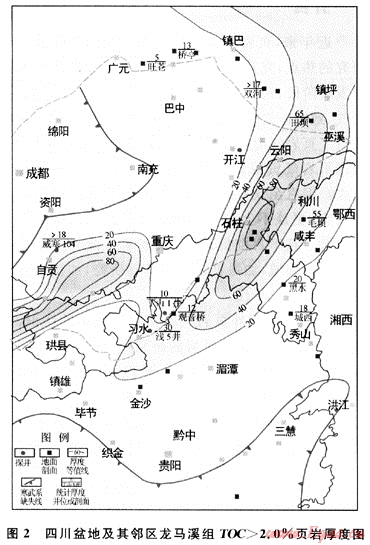 圖2是四川盆地及其鄰區(qū)下志留統(tǒng)龍馬溪組TOC>2.0%的黑色頁巖累計厚度分布圖。由圖2可見,龍馬溪組TOC>2.0%高值區(qū)分布于川東石柱-鄂西利川,黑色頁巖厚達100m,川北鎮(zhèn)巴黑色頁巖厚20m,川南瀘州一帶厚60~80m。3個高值區(qū)的分布在地質(zhì)上和川東-鄂西深水陸棚沉積相帶、川北深水陸棚沉積相帶以及川南深水陸棚沉積相帶分布相吻合。