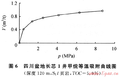 圖6為長芯1井120m處所取巖心的等溫吸附曲線(70℃等溫),該樣品為志留系龍馬溪組黑色頁巖,有機碳含量為5.9%,成熟度為3.26%。在70℃等溫條件下,隨著壓力增高,頁巖吸附甲烷的能力(V)逐漸增大,在壓力達到8.5MPa時,頁巖的甲烷吸附能力達到1m3/t。通過與美國5大頁巖氣盆地的頁巖等溫吸附曲線對比可以發(fā)現(xiàn),長芯1井志留系頁巖的吸附能力除與圣胡安盆地白堊系Lewis頁巖相近外,均低于其他盆地的頁巖。究其原因,筆者認(rèn)為很可能與成熟度有關(guān)。目前發(fā)現(xiàn)的進行商業(yè)開發(fā)的美國5大頁巖氣盆地的頁巖,成熟度普遍不高,介于0.4%~1.9%之間。而熱成因的頁巖氣藏,頁巖成熟度較高,大多在1.1%以上,最高不超過3%。四川盆地長芯1井志留系頁巖的成熟度過高,Ro達到了3.26%,已進入過成熟階段,這可能是導(dǎo)致其吸附能力較低的主要原因。另仔細分析可以發(fā)現(xiàn),美國5大頁巖氣盆地中圣胡安盆地白堊系Lewis頁巖的成熟度最高,為1.6%~1.88%,其頁巖的吸附能力則最小。