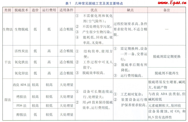 脫硫工藝一般可劃分為3類:生物法、干法、濕法。多數(shù)情況下,單項脫硫工藝很難完全滿足要求,通常需要采用組合工藝,例如生物法進行粗凈化,吸附法(干法)進行深度凈化。表1列舉了常見的幾種脫硫工藝及其主要特點[2]。