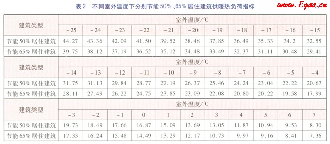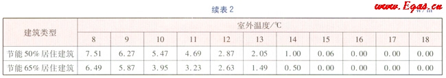 根據(jù)文獻[1]及GB 50736—2012《民用建筑供暖通風與空氣調節(jié)設計規(guī)范》、JCJ 26—2010《嚴寒和寒冷地區(qū)民用建筑節(jié)能設計標準》、JGJ 26—5《民用建筑節(jié)能設計標準(供暖居住建筑部分)》規(guī)定的汁算參數(shù),以烏魯木齊市供熱區(qū)域內某居住建筑為例,進行能耗分析。該建筑坐北朝南,共6層,建筑高度為16.8m,總建筑面積為4112.64m2,體形系數(shù)為0.28。節(jié)能50%居住建筑外墻傳熱系數(shù)為0.43W/(m2·K),外窗的傳熱系數(shù)為2.47W/(m2·K);節(jié)能65%居住建筑外墻傳熱系數(shù)為0.35W/(m2·K),外窗傳熱系數(shù)為1.8W/(m2·K)。計算得出不同室外溫度(室外溫度取整數(shù))時,該居住建筑分別節(jié)能65%、50%時的供暖熱負荷指標,計算結果見表2。當室外溫度達到16℃時,鍋爐停止供暖,熱負荷指標為0,但由于烏魯木齊的晝夜溫差可逾20℃,因此存在白天停止供暖,傍晚及夜間又恢復供暖的情況。