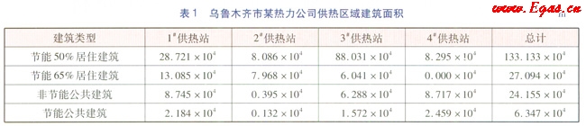通過走訪、調研統(tǒng)計出該熱力公司(下轄4座供熱站)供熱區(qū)域內的各類建筑的面積(見表1)。由表1可知,烏魯木齊市某熱力公司總供熱面積為190.729×104m2,其中節(jié)能50%居住建筑面積為133.133×104m2,節(jié)能65%居住建筑面積為27.094×104m2,非節(jié)能公共建筑面積為24.155×104m2,節(jié)能公共建筑面積為6.347×104m2。