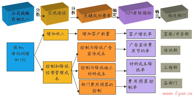 必須先確定公司的戰(zhàn)略目標或年度目標。在公司戰(zhàn)略目標或年度目標確定后再進行層層分析。從一個具體的戰(zhàn)略目標或年度目標到特定部門的考核指標,要經(jīng)過一系列的過程(見下圖)。