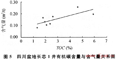 頁巖氣的勘探生產(chǎn)價(jià)值取決于其中游離氣和吸附氣的含量,游離氣的含量高低與其構(gòu)造保存條件密切相關(guān),而吸附氣含量受溫度、壓力等環(huán)境因素影響,在相同情況下,吸附氣量高低與有機(jī)質(zhì)含量呈正相關(guān)。上揚(yáng)子地區(qū)志留系烴源巖有機(jī)質(zhì)豐度高,預(yù)計(jì)將會(huì)在構(gòu)造保存條件差異較大的地區(qū)分別形成不同含氣量及含氣特點(diǎn)的頁巖氣聚集。在四川盆地,除已發(fā)現(xiàn)過去的老井在鉆探志留系頁巖段時(shí)具有豐富的氣顯示之外,目前完鉆的長芯1井初步分析結(jié)果顯示,在埋深淺于150 122龍馬溪組頁巖層段內(nèi),同樣發(fā)現(xiàn)了頁巖氣存在的證據(jù)(表2)。8個(gè)頁巖巖心的含氣量實(shí)驗(yàn)結(jié)果顯示(解析溫度70℃),每噸巖石含氣量為0.08~0.25m3,平均為0.15m3/t。另從110m和120m巖樣的甲烷碳同位素分別為-40.2‰和-52.3‰來看,頁巖氣應(yīng)為熱成因的天然氣。有機(jī)質(zhì)豐度與含氣量的關(guān)系則顯示(圖5),同美國頁巖一樣,同樣具有有機(jī)碳含量與含氣量呈正相關(guān)的關(guān)系,即有機(jī)質(zhì)豐度越高,含氣量越大。