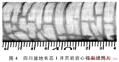 上揚(yáng)子地區(qū)除四川盆地外,其余地區(qū)勘探程度非常低,且無論是四川盆地還是四川盆地以外的探區(qū),已往的油氣勘探實(shí)踐中,都沒有把頁巖地層當(dāng)做有效目的儲(chǔ)層對待。因此,開展頁巖儲(chǔ)層的研究甚少[3~4]。四川盆地長寧構(gòu)造所鉆的長芯1井8個(gè)志留系頁巖樣品的巖礦組成分析結(jié)果見表1。長寧構(gòu)造龍馬溪組頁巖巖礦組成中,黏土最多,含量為26.5%~59.5%,平均48.25%,其次是石英,含量為20.5%~29.7%,平均25.3%,方解石含量為4.1%~26.9%,平均12.4%。與美國已知含氣頁巖相比,該井硅質(zhì)(石英)含量偏少,而黏土(伊利石為主)含量偏高,根據(jù)美國經(jīng)驗(yàn),這似乎對頁巖儲(chǔ)層的脆性有影響。但仔細(xì)分析發(fā)現(xiàn),該井的方解石總量較高,石英和方解石總量達(dá)37%,表明該套頁巖具有脆性巖石組分。野外剖面可見風(fēng)化破碎的龍馬溪組筆石頁巖,且在露頭和長芯1井巖心上均可發(fā)現(xiàn)頁巖高角度縫和微裂縫十分發(fā)育(圖4),揭示了該區(qū)頁巖具有良好的脆性特征。