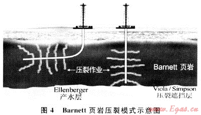 作為目前美國最活躍的頁巖氣遠景區(qū),沃斯堡盆地Barnrtt頁巖的開發(fā)充分說明了直接及時的微地震描述技術的重要性[20~21]。經(jīng)營者運用該技術認識到天然裂縫和斷層對水力壓裂裂縫的延伸及儲層產(chǎn)能和開采產(chǎn)生很大影響。2005年,美國Chesapeak能源公司于將微地震技術運用于一口垂直監(jiān)測井上,準確地確定了Newark East氣田一口水平井進行的4段清水壓裂的裂縫高度、長度、方位角及其復雜性,改善了對壓裂效果的評價[19]。