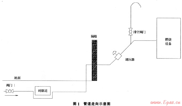 管道概況:新建管道長約200m,設(shè)計壓力為0.4MPa。從一支線閥門井用de110的PE管道接出后埋地鋪設(shè),途中從一地下磚制煙道下方下翻穿越,之后穿出地面改為DN100鋼制管道進入車間,經(jīng)調(diào)壓、計量后接入燃燒設(shè)備(圖1)。管道建成后經(jīng)過空氣強度和氣密性試驗合格。