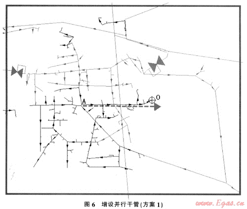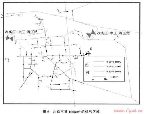 如圖5所示為北京市某區(qū)域天然氣管網(wǎng)圖,其供氣區(qū)域約為100km2。此區(qū)域內(nèi)中壓管網(wǎng)氣源,為兩座高中調(diào)壓站,供應壓力為0.2MPa,高時總負荷70000(m3/h),負荷點422個.根據(jù)管網(wǎng)模擬軟件計算可知末端壓力為0.131MPa。處于該區(qū)域的東部(如上圖黑管線)。根據(jù)規(guī)劃此區(qū)域內(nèi)負荷將有明顯的增加.因此.必須提早做出切實可行的管網(wǎng)改造方法。