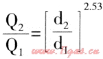 舊有的管網(wǎng)系統(tǒng)中管徑較小的管道有可能是制約管網(wǎng)通過能力的瓶頸。通過管網(wǎng)計算,北京市中壓管網(wǎng)主干線個別管段由于管徑較小,嚴重阻礙了管網(wǎng)輸送,應將此管段進行擴徑,如香山南路管線,管徑為DN400。全長4000m。其中有一段DN100,導致附近壓力偏低,若將此段管線改為DN400,附近壓力由0.04MPa,升到0.06MPa。圖5所示為擴大管徑對管輸能力提高倍數(shù)的影響,計算式: