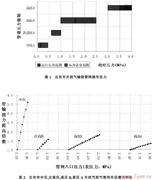 2008年—2009年冬季高峰日輸送氣量為4230萬m3,小時高峰輸送量為210萬m3。自1997年以來,年高峰日輸送量平均增長率超過40%。若實現(xiàn)北京市120億m3天然氣供應量目標,據(jù)測算,高峰輸送量為10500萬m3,高峰小時輸送量為580萬m3。在現(xiàn)有管網(wǎng)最大運行壓力下,提高輸送能力的方法。一是增加進氣點既建調(diào)壓站,二是增加管線建設。北京天然氣高壓以上管線僅占總管線長度的8.6%,合理增建高壓管線是有必要的,也是有條件的。但中壓管線已占總管線長度的40%,中壓天然氣管線幾乎遍布市區(qū)所有主干公路,據(jù)北京天然氣管網(wǎng)規(guī)劃。2020年中壓管網(wǎng)輸送能力將由目前150萬m3增加到255萬m3。單靠增加中壓管線建設提高管網(wǎng)輸送能力即不經(jīng)濟也不現(xiàn)實。因此,如何提高現(xiàn)有管網(wǎng)的輸送能力,是我們亟待解決的問題。
