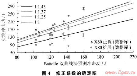 新頒布的ISO 3183 2007中給出了幾種常用的止裂韌性預(yù)測(cè)方法的適用范圍(見(jiàn)表2)。可見(jiàn),對(duì)于西二線,只有Battelle雙曲線法適用。ISO 3183—2007進(jìn)一步指出,當(dāng)預(yù)測(cè)結(jié)果大于100J時(shí),應(yīng)對(duì)預(yù)測(cè)結(jié)果進(jìn)行修正。而修正系數(shù)是由已經(jīng)進(jìn)行的全尺寸實(shí)物爆破試驗(yàn)結(jié)果確定的。由圖4得出西二線止裂韌性修正系數(shù)為1.43。幾種預(yù)測(cè)結(jié)果對(duì)比如表3所示。