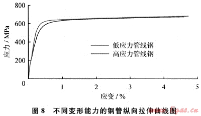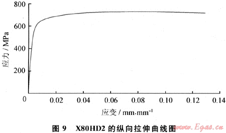 用于西二線的抗大變形鋼管已試制成功。表4是西二線抗大變形管線鋼技術(shù)條件對(duì)縱向拉伸性能的要求。表5為外徑1219mm、壁厚22mm X80HD2鋼管的縱向拉伸性能測(cè)試結(jié)果。圖9為其縱向拉伸曲線。根據(jù)此拉伸曲線,利用FEM(Finite Element Method)方法進(jìn)行壓縮和彎曲載荷下的應(yīng)變能力計(jì)算,結(jié)果見(jiàn)表6。