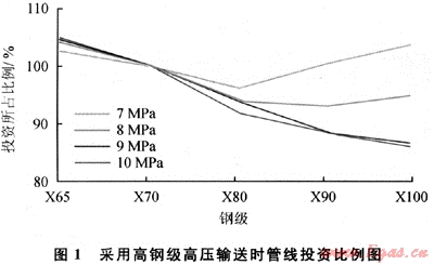 在日益激烈的市場(chǎng)競(jìng)爭(zhēng)中,全球各石油公司都在不斷尋找降低成本的途徑。在管線項(xiàng)目投資中,鋼管的成本占40%左右,采用高鋼級(jí)管線鋼管可以減小壁厚,高壓輸送可以在不改變輸量的情況下減小管徑。管徑和壁厚的減小可帶來(lái)工程費(fèi)用的降低。因此,采用高鋼級(jí)管線鋼管和高壓輸送可有效降低輸送成本。在1998年舉行的國(guó)際管道會(huì)議上,加拿大的NOVA公司介紹了該公司采用高鋼級(jí)管線鋼管和高壓輸送的效益情況[5]。圖1所示為采用不同鋼級(jí)管線鋼管和不同輸送壓力時(shí)管線的投資對(duì)比情況[5]。可見(jiàn),在高壓輸送時(shí),采用高鋼級(jí)管線鋼管可明顯降低管道成本。