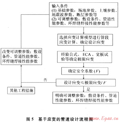 中石油《西氣東輸二線工程關(guān)鍵技術(shù)研究》重大專項(xiàng)設(shè)置課題研究了西二線基于應(yīng)變的設(shè)計(jì)方法并進(jìn)行了抗大變形管線鋼的研究與開(kāi)發(fā)。中石油規(guī)劃設(shè)計(jì)總院和管道設(shè)計(jì)院編制了《西氣東輸二線管道工程強(qiáng)震區(qū)和活動(dòng)斷層區(qū)段埋地管道基于應(yīng)變?cè)O(shè)計(jì)導(dǎo)則》[10~11]。基于應(yīng)變的管道設(shè)計(jì)流程如圖5所示。核心環(huán)節(jié)是設(shè)計(jì)應(yīng)變小于等于極限應(yīng)變/安全系數(shù)。此處的極限應(yīng)變就是鋼管應(yīng)力-應(yīng)變曲線中的屈曲應(yīng)變。它可以直接由鋼管實(shí)物試驗(yàn)測(cè)出,也可由經(jīng)驗(yàn)公式、ECA(Engineer Critical Assessment)、寬板試驗(yàn)等確定。
