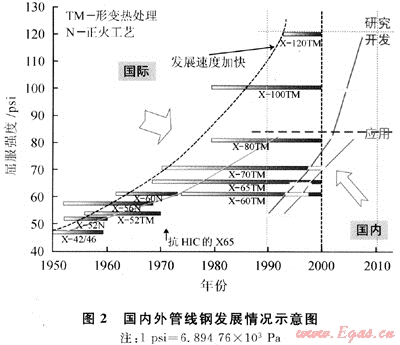 提高管線鋼管鋼級(jí)和輸送壓力是天然氣管道建設(shè)強(qiáng)勁的發(fā)展趨勢(shì),API標(biāo)準(zhǔn)的發(fā)展也反映了這種趨勢(shì)。圖2為我國(guó)與發(fā)達(dá)國(guó)家管線鋼發(fā)展情況對(duì)比示意圖[6]。20世紀(jì)90年代之前,我國(guó)天然氣管道普遍采用A3、16Mn、TS52K等低強(qiáng)度焊管,輸送壓力大都在4MPa以下。我國(guó)按API標(biāo)準(zhǔn)生產(chǎn)和使用管線鋼管比發(fā)達(dá)國(guó)家滯后約40年。1993年,陜京管線采用X60鋼級(jí)、6.4MPa壓力,縮小了與發(fā)達(dá)國(guó)家的差距;2000年,西氣東輸(為便于區(qū)別,以下稱為西氣東輸一線)管線采用X70鋼級(jí)、10MPa壓力,跟上了發(fā)達(dá)國(guó)家的步伐;現(xiàn)在,西氣東輸二線干線全部采用X80鋼級(jí),西段采用12MPa設(shè)計(jì)壓力,使我國(guó)管道建設(shè)跨上了新的臺(tái)階。就全球已經(jīng)建成和正在建設(shè)的X80輸氣管道而言,無(wú)論是設(shè)計(jì)壓力、管道長(zhǎng)度,還是管徑、壁厚,西氣東輸二線(簡(jiǎn)稱西二線)均堪稱世界之最。