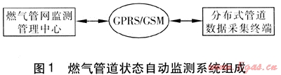 燃氣管道狀態(tài)自動監(jiān)測系統(tǒng)包括監(jiān)測管理中心、GPRS/GSM(GPRS為通用分組無線業(yè)務,GSM為全球移動通信系統(tǒng))、分布式管道數據采集終端,系統(tǒng)組成見圖1。