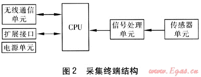 采集終端包括傳感器單元、信號處理單元、系統(tǒng)控制(CPU)單元、無線通信單元和電源單元等。采集終端結構見圖2。