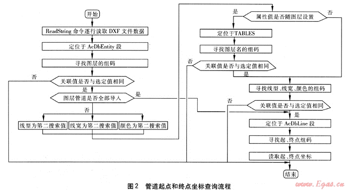 圖2為管道的起點(diǎn)和終點(diǎn)坐標(biāo)的查詢流程圖。程序首先打開儲(chǔ)存管網(wǎng)信息的DXF文件,調(diào)用VC的ReadString命令逐行讀取管網(wǎng)數(shù)據(jù)。當(dāng)查詢到儲(chǔ)存線段信息的AcDbEntity段,找到線段的圖層名組碼,如果組碼的關(guān)聯(lián)值與導(dǎo)入管網(wǎng)簡圖命令對(duì)話框的選定值相同,接著判斷此圖層中線段是否全部導(dǎo)入,如果全部導(dǎo)入,定位于AcDbEntity段下的AcDbLine子段,讀取線段的起點(diǎn)和終點(diǎn)坐標(biāo);如果還需要根據(jù)圖層中線段的屬性信息進(jìn)一步進(jìn)行篩選,則首先需要判斷是根據(jù)線段的顏色、線型、線寬3個(gè)屬性中哪個(gè)屬性進(jìn)行選擇。例如選擇的是顏色屬性,首先判斷線段的顏色是否隨圖層設(shè)置,如果隨圖層設(shè)置,在TABLES段中,尋找圖層名的組碼,確定組碼的關(guān)聯(lián)值與選定值相同的圖層,接著尋找此圖層名下線段的顏色的組碼,如果組碼的關(guān)聯(lián)值與選定值相同,在AcDbLine段中找到此線段,然后讀取起點(diǎn)和終點(diǎn)坐標(biāo);如果線段的顏色不隨圖層設(shè)置,則直接在AcDbLine段中根據(jù)管道顏色找到該線段的起點(diǎn)和終點(diǎn)坐標(biāo)即可[6~7]。
