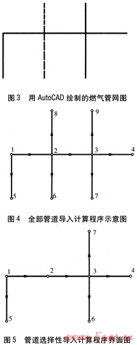 目前已有利用Visual C++開發(fā)的水力計(jì)算程序,可以在可視化界面中由用戶利用鼠標(biāo)點(diǎn)擊繪制管網(wǎng)計(jì)算圖。在管段和節(jié)點(diǎn)附近的空間范圍內(nèi)雙擊鼠標(biāo)左鍵,彈出相應(yīng)對(duì)話框,輸入管段和節(jié)點(diǎn)參數(shù),實(shí)現(xiàn)管網(wǎng)和數(shù)據(jù)的緊密結(jié)合。同時(shí)程序具有管段刪除、截?cái)?、改變顏色、流向等編輯功能,方便管網(wǎng)的新建和改建。并利用解節(jié)點(diǎn)方程組法對(duì)單氣源與多氣源、高中壓與低壓、環(huán)狀與枝狀管網(wǎng)進(jìn)行快速、準(zhǔn)確的水力計(jì)算,并可將結(jié)果自動(dòng)標(biāo)注在水力計(jì)算圖中[2]。本文在此程序基礎(chǔ)上開發(fā)管網(wǎng)拓?fù)浣Y(jié)構(gòu)圖的自動(dòng)導(dǎo)入功能。