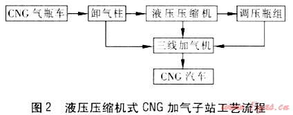 液壓壓縮機(jī)式CNG加氣子站是利用液壓壓縮機(jī)從氣瓶車中吸氣,加壓后通過(guò)站內(nèi)的三線雙槍加氣機(jī)把高壓天然氣充入CNG汽車的車載儲(chǔ)氣瓶?jī)?nèi),達(dá)到給汽車加氣的目的。