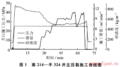 由于炮眼磨損引起的施工壓力變化在限流法壓裂施工曲線中有很明顯的顯示,圖1是南214-平324井的主壓裂施工曲線,從圖中可以看出支撐劑到達井底后,井口壓力大幅度下降,這在其他壓裂方式中是沒有的現(xiàn)象。此現(xiàn)象是由于支撐劑加入引起的混砂液凈液柱壓力、管柱摩阻和孔眼摩阻的變化綜合作用的結(jié)果。根據(jù)南214-平324井的井身結(jié)構(gòu)及施工情況定量計算出前兩項的值[6~7],可以發(fā)現(xiàn)它們對施工壓力的影響遠沒有這么大,因此可以判斷出現(xiàn)施工壓力如此大幅度降低的主要原因是孔眼受支撐劑打磨孔徑變大后,摩阻急劇降低造成的,但目前的壓裂設計軟件還不能模擬孔眼摩阻的動態(tài)變化對裂縫形態(tài)的影響。