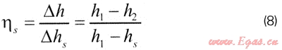 在透平膨脹機(jī)中,標(biāo)志能量轉(zhuǎn)換過程完善程度的指標(biāo)就是效率。從理論上來說,膨脹工質(zhì)在給定的進(jìn)、出口條件下可能實(shí)現(xiàn)的最大比焓降應(yīng)為等熵比焓降△hs,因此等熵比焓降是一個(gè)比較的標(biāo)準(zhǔn)。透平膨脹機(jī)進(jìn)、出口實(shí)際比焓降△h與等熵比焓降之比稱為等熵效率[14]: