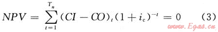 依據(jù)技術(shù)經(jīng)濟評價盈虧平衡原理,采用現(xiàn)值法,將投入和產(chǎn)出均折算為評價起始年的累計凈現(xiàn)值(NPV)為零作為極限,基本公式如下: