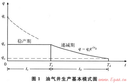 油氣井開采一般都要求有一段時間的穩(wěn)產(chǎn)期(Te),然后再進入遞減階段生產(chǎn)(圖1),而穩(wěn)產(chǎn)期的平均日產(chǎn)量(qe),就是本文所指的儲量起算標準產(chǎn)量。