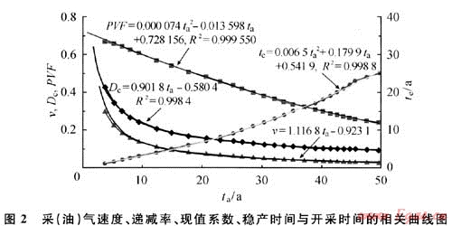 根據(jù)圖1模式生產(chǎn),以目前通用的石油行業(yè)基準收益率12%作為貼現(xiàn)率(ic),那么系數(shù)j=0.11333。通過理論計算,可以得出圖2所示的采(油)氣速度、遞減率、現(xiàn)值系數(shù)、穩(wěn)產(chǎn)時間與總生產(chǎn)時間的相關(guān)曲線。
