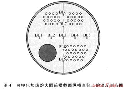 為對(duì)上述結(jié)論加以驗(yàn)證,進(jìn)行了大圓筒內(nèi)介質(zhì)流動(dòng)的可視化流場(chǎng)試驗(yàn),試驗(yàn)?zāi)康氖菍?duì)實(shí)測(cè)數(shù)據(jù)和觀察到的情況進(jìn)行分析,為加熱爐實(shí)物的試驗(yàn)和實(shí)際設(shè)計(jì)打基礎(chǔ)。考慮到大圓筒內(nèi)流場(chǎng)分布可能較紊亂,因此采用可視手段,目的是能夠觀察到流場(chǎng)的基本動(dòng)向。試驗(yàn)用可視化加熱爐大圓筒外殼由有機(jī)玻璃構(gòu)成,火筒和煙管束由黃銅制成,布置于大圓筒下方,用電加熱器加熱空氣模擬煙氣流入火筒經(jīng)轉(zhuǎn)向室流入煙管束然后排入大氣,電加熱器采用2kW、4kW、6kw的功率,由此形成熱風(fēng)循環(huán)系統(tǒng);大圓筒內(nèi)中間載熱介質(zhì)采用水,因水量較大,為使試驗(yàn)時(shí)介質(zhì)水的溫度能迅速達(dá)到要求,設(shè)計(jì)了預(yù)熱水系統(tǒng),即專門配備了預(yù)熱水箱,內(nèi)有電加熱器能較快地加熱介質(zhì)水,使其達(dá)到預(yù)定溫度后再注入大圓筒內(nèi);對(duì)流管束受熱面由紫銅管制成,布置于大圓筒上方,對(duì)流管束彎成“U”型,一端為進(jìn)口,一端為出口,被加熱流體為空氣,為控制其初始溫度,在冷風(fēng)系統(tǒng)中配有空調(diào)器以降低空氣溫度。為測(cè)量大圓筒圓截面上流場(chǎng)的溫度分布,在圓截面的縱軸和橫軸上布置了溫度測(cè)點(diǎn),編號(hào)分別為BL1~9,如圖4所示。試驗(yàn)時(shí)同時(shí)開(kāi)啟冷風(fēng)及熱風(fēng)循環(huán)系統(tǒng),并通過(guò)預(yù)熱水系統(tǒng)將大圓筒內(nèi)中間載熱介質(zhì)水的溫度控制在41.7℃和63℃,以觀察流場(chǎng),并測(cè)試不同加熱功率對(duì)大圓筒內(nèi)水溫的影響。