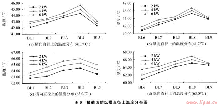 測(cè)試結(jié)果由圖5所示,在不同的加熱功率下,橫軸上測(cè)點(diǎn)BL4的溫度最高,縱軸上測(cè)點(diǎn)BL8的溫度最高,因?yàn)檫@兩個(gè)測(cè)點(diǎn)離火筒位置最近,而火筒是模擬煙氣的入口,氣流溫度最高,測(cè)點(diǎn)BL3至BL4的溫度變化幅度在中間載熱介質(zhì)水溫為41.7℃時(shí)比為63℃時(shí)大,其原因是介質(zhì)水溫較低時(shí),與火筒內(nèi)的氣流溫差較大,使火筒壁面附近對(duì)流換熱加大,介質(zhì)水溫上升快,因此火筒周圍形成了較強(qiáng)的上升流;而介質(zhì)水溫為63℃時(shí),由于介質(zhì)與氣流間的溫差較小,對(duì)流換熱相對(duì)弱,上升流的動(dòng)力也小??v軸上各測(cè)點(diǎn)溫度顯示:在不同的加熱功率和中間載熱介質(zhì)溫度下,溫度分層現(xiàn)象明顯,測(cè)點(diǎn)BL8溫度最高,自BL3、BL7至BL6依次降低,而B(niǎo)L9比BL8低,但高于其他測(cè)點(diǎn),這與流場(chǎng)換熱狀況相吻合;測(cè)點(diǎn)BL6的溫度,在加熱功率較小時(shí),會(huì)低于介質(zhì)溫度,表明在此附近區(qū)域加熱氣流提供的熱量不足,被加熱氣流只能吸收中間載熱介質(zhì)的初始熱量達(dá)到升溫的目的。試驗(yàn)結(jié)果證實(shí)了數(shù)值計(jì)算反映的大圓筒中間載熱介質(zhì)天然氣加熱爐流場(chǎng)中存在的問(wèn)題。