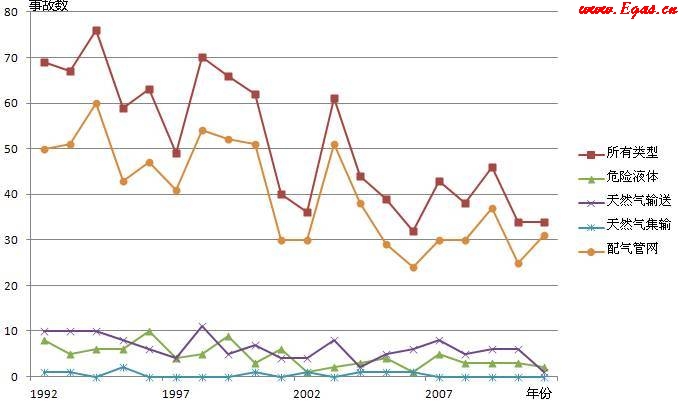 根據(jù)美國PHMSA管道失效數(shù)據(jù)庫統(tǒng)計,管道系統(tǒng)發(fā)生的重特大事故中,約80%是由城鎮(zhèn)燃氣管網(wǎng)導致的事故(見圖 1),因此針對城鎮(zhèn)燃氣管網(wǎng)開展完整性管理具有重要意義。美國針對DIMP的研究從2000年左右開始。2005年管道和危險材料安全管理局(Pipeline&HazardousMaterialsSafetyAdministration,簡稱PHMSA)、燃氣輸配工業(yè)協(xié)會和國家管道安全協(xié)會共同發(fā)布了《燃氣輸配管道完整性管理——第一階段調研報告》,此后美國有多家相關的政府機構、協(xié)會組織和研究機構參與了燃氣管網(wǎng)完整性管理的研究工作,并進行相關標準的制定以及完整性管理開展情況的檢查和審查工作。