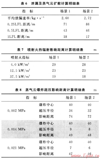 各場(chǎng)景泄漏、擴(kuò)散、火災(zāi)和蒸氣云延遲爆炸的計(jì)算結(jié)果見表6~8。