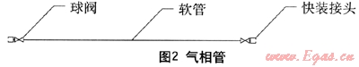 圖2為氣相管路,主要實(shí)現(xiàn)事故槽車、卸車壓縮機(jī)和搶險(xiǎn)槽車的連接,主要由球閥、軟管和快裝接頭組成。由于設(shè)備及槽車所用快裝接頭皆為陽接頭,故軟管上所配接頭采用陰接頭。