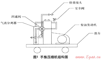 圖1所示的手推式壓縮機(jī)采用活塞式小型壓縮機(jī),動力源采用手搖啟動式柴油隔爆發(fā)動機(jī)。四通閥主要用于改變管路中氣流前進(jìn)方向,從而實(shí)現(xiàn)不拆卸情況下的輸送方向,滿足卸車和氣相回收的功能。壓縮機(jī)出口安裝有安全閥,當(dāng)?shù)构尴掠螇毫^高時對壓縮機(jī)設(shè)備進(jìn)行保護(hù)。整個橇體的進(jìn)出口采用快裝接頭,使設(shè)備在現(xiàn)場的快速安裝成為可能。
