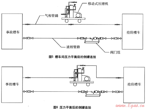 (3) 當(dāng)壓縮機(jī)上入口壓力降低到2.8bar(294Pa)以下時候關(guān)閉事故槽車氣相出口和搶險(xiǎn)槽車氣相出口,同時關(guān)閉柴油發(fā)動機(jī)。關(guān)閉事故槽車的液相口,同時各管段上閥門關(guān)閉后拆卸,倒罐流程到此結(jié)束。可根據(jù)現(xiàn)場實(shí)際情況安排后續(xù)的氮?dú)庵脫Q和吊裝拖運(yùn)。
