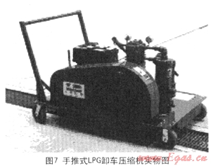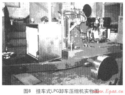 圖7手推式LPG卸車壓縮機(jī)可以實(shí)現(xiàn)在小片區(qū)域的人工改變位置,從而為小片區(qū)域的多個卸車點(diǎn)進(jìn)行卸車;圖8為掛車式LPG卸車壓縮機(jī),其中配備了更加齊全的附加設(shè)備,從而實(shí)現(xiàn)了大片區(qū)域的不同地點(diǎn)的卸車需求。目前該種移動式應(yīng)急卸車設(shè)備在香港加德士石油公司、香港加德士石油公司、香港殼牌有限公司及汕頭加德士海洋燃?xì)庥邢薰九鋫涫褂?,?yīng)該算作是用于搶險(xiǎn)卸車的雛形狀態(tài)。