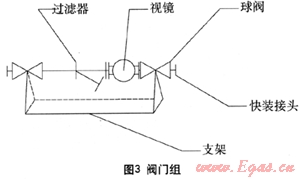 圖3所示閥門組主要是將一些液相管路上必須的設(shè)備集成在一個支架上以滿足進(jìn)行快速的安裝需要。主要包括過濾器、視鏡、球閥、快裝接頭和支架。視鏡主要是用于觀測液相管路中液相輸送情況,其內(nèi)部自帶止回閥,可防止搶險(xiǎn)槽車中的液相回流至事故槽車。