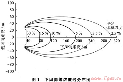 在LNG場站選址時(shí),需要遠(yuǎn)離居民區(qū),以保證人民生命財(cái)產(chǎn)安全,因此,場站與居民區(qū)之間的距離是重要的考慮因素。LNG在泄漏過程中,自泄漏源開始,氣體濃度逐漸被稀釋,當(dāng)其體積濃度在5%~15%范圍內(nèi)(即甲烷的爆炸極限內(nèi)),存在發(fā)生火災(zāi)或者爆炸的可能性。為了確保間隔距離劃定的可靠性,相關(guān)標(biāo)準(zhǔn)(如NFPA59A),規(guī)定其下風(fēng)向體積濃度為2.5%處的距離為安全距離[4]。以Burro系列5號(hào)實(shí)驗(yàn)為例(以下簡稱B5),其下風(fēng)向上體積濃度的等濃度線見圖1,可以看出下風(fēng)向體積濃度5%和2.5%的最大距離差約為110m。以下用所建的計(jì)算模型,對(duì)氣體擴(kuò)散過程和安全距離的影響因素進(jìn)行分析。