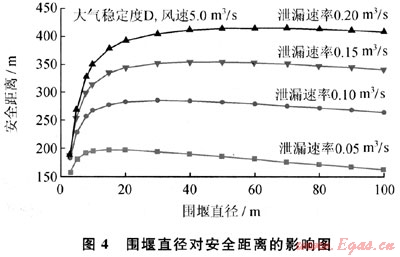 LNG儲(chǔ)罐周圍通常要設(shè)計(jì)圍堰,以防止儲(chǔ)罐發(fā)生泄漏時(shí),液體四處流淌蔓延,若發(fā)生火災(zāi),還可以防止火焰蔓延到周邊地區(qū)[4]。LNG泄漏到圍堰內(nèi),會(huì)迅速蒸發(fā)氣化,形成以圍堰為二次源的蒸氣云團(tuán)擴(kuò)散。圖4給出下風(fēng)向安全距離隨著圍堰直徑和泄漏速率的變化。當(dāng)圍堰尺寸較小時(shí),以圍堰為二次源云團(tuán)的范圍也較小,有限的蒸發(fā)氣受大氣湍流影響,其濃度較快稀釋,安全距離較小;當(dāng)圍堰尺寸過于增大時(shí),二次源云團(tuán)的天然氣濃度較低,其下風(fēng)向擴(kuò)散距離不再增加,反而略有減少。