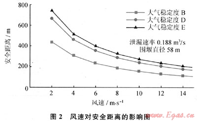 所建立的LNG泄漏氣體擴(kuò)散模型計(jì)算方法,經(jīng)過實(shí)驗(yàn)驗(yàn)證,其平均偏差為24.28%,并較準(zhǔn)確地體現(xiàn)了重氣擴(kuò)散過程中云團(tuán)內(nèi)部特性的變化規(guī)律。對(duì)于穩(wěn)態(tài)LNG氣體擴(kuò)散,當(dāng)風(fēng)速大于2m/s時(shí),隨著風(fēng)速的增加,安全距離是逐漸減小的;對(duì)于較小風(fēng)速(小于2m/s)時(shí),該穩(wěn)態(tài)模型將不再適用。泄漏速率增大使安全距離幾乎成比例增大,是影響安全距離最重要因素之一。對(duì)于給定的LNG泄漏率,圍堰尺寸變化對(duì)安全距離的影響會(huì)呈現(xiàn)出一個(gè)弱峰,之后安全距離會(huì)隨圍堰尺寸的增加而略有減小。
