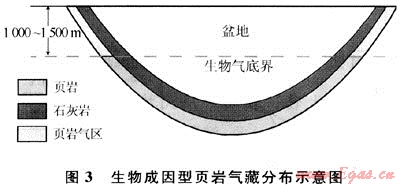 目前發(fā)現(xiàn)的生物成因型頁巖氣藏分兩類:①早成型,氣藏的平面形態(tài)為毯狀,從頁巖沉積形成初期就開始生氣,頁巖氣與伴生地層水的絕對年齡較大,可達66Ma,如美國Williston盆地上白堊統(tǒng)Carlile頁巖氣藏;②晚成型,氣藏的平面形態(tài)為環(huán)狀(圖3),頁巖沉積形成與開始生氣間隔時間很長,主要表現(xiàn)為后期構造抬升埋藏變淺后開始生氣,頁巖氣與伴生地層水的絕對年齡接近現(xiàn)今,如美國Michigan盆地的Antrim頁巖氣藏[7]。生物成因型頁巖氣藏以Antrim頁巖氣藏最有代表性。