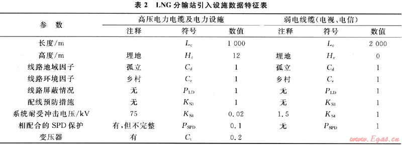 LNG分輸站電力系統(tǒng)由當?shù)仉姌I(yè)局敷設(shè),將市電電源架空進線裝于10kV電桿上引至LNG分輸站內(nèi)變、配電房,經(jīng)帶保護外殼干式變壓器變壓后向LNG分輸站內(nèi)設(shè)備供電。經(jīng)檢測,高壓架空線電桿高度Hc為12m,詳見表2,而經(jīng)查詢上述變壓器參數(shù)資料,得出系統(tǒng)耐受沖擊電壓為75kV。因此KS4為0.02(1.5/75),詳見表2。