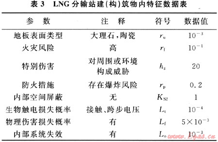 LNG分輸站內(nèi)電力設(shè)施由配電房引出低壓配電線路至各區(qū)域,包括綜合樓、工藝設(shè)備區(qū)及路燈處,均采用套鋼管埋地敷設(shè),但埋地鋼管未在兩端進行接地處理,未形成屏蔽層的作用,而線路在敷設(shè)過程中形成了大面積回路,因此PLD為1、KS3為1,詳見表2、表3。同樣,站內(nèi)弱電線纜(從站控室引出至工藝設(shè)備區(qū)各設(shè)備的控制線路及消防報警線路)的外套鋼管也未進行兩端接地處理,取值與電力設(shè)施相同。