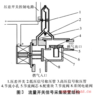 流量信號(hào)的獲取可以有多種途徑,比如可以通過燃?xì)獗恚部梢栽O(shè)置專門的流量傳感器獲取流量信號(hào)。對(duì)于大流量的泄漏,普通的流量檢測(cè)方法就可以了,但有些泄漏是很微量的,比如接頭的松動(dòng)、膠管的老化等,普通的流量檢測(cè)方法很難滿足。能夠檢測(cè)微小流量的流量傳感器其流通能力也一定是很小的,如果將其安裝在管道上,必然在正常使用的流量下形成很大的阻力,因此需要找到一種既能檢測(cè)微小流量,又不會(huì)造成較大阻力的流量檢測(cè)裝置。流量開關(guān)信號(hào)采集裝置很好地解決了這個(gè)問題,其結(jié)構(gòu)見圖3。