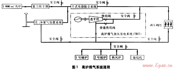 天津鋼管制鐵有限公司煤氣系統(tǒng)的工藝流程是[1]:高爐產(chǎn)生的煤氣通過高爐下降管至重力除塵器,重力除塵器后的荒煤氣至干式布袋除塵系統(tǒng),干式除塵后的凈煤氣通過調(diào)壓閥組或高爐煤氣余壓發(fā)電系統(tǒng)(TRT)調(diào)壓后至凈煤氣管網(wǎng),通過凈煤氣管網(wǎng)分配給用戶。高爐煤氣的用戶主要是3臺頂燃式熱風(fēng)爐、2臺鍋爐、1臺燒結(jié)機(jī),剩余煤氣放散。高爐頂壓為180kPa,調(diào)壓后的煤氣壓力為9kPa,高爐煤氣平均流量20×104m3/h,最大流量為23×104m3/h,熱風(fēng)爐的用氣量為(6~10)×104m3/h,鍋爐的用氣量為7×104m3/h,燒結(jié)機(jī)的用氣量為8000m3/h,有(2.2~9.2)×104m3/h煤氣需通過放散塔放散。高爐煤氣系統(tǒng)流程見圖1。