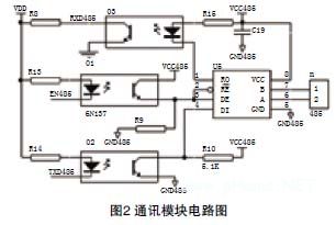 本機(jī)有時(shí)需外接工控機(jī)進(jìn)行精準(zhǔn)測(cè)量,所以本機(jī)留有RS485接口用于通訊??紤]到通訊可靠和操作員的安全,本機(jī)通訊接口采用了光電隔離。通訊模塊電路布置如圖2。